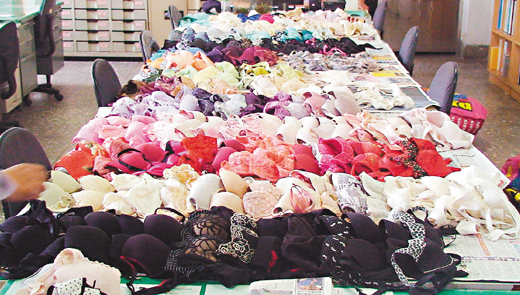 臺中縣警方在桌上整理周姓男子偷來的女性內衣,讓民眾誤以為是母親節內衣特賣會。 來源:臺灣《聯合報》