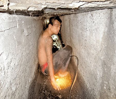 救援的警消無法鉆入,只能將頭伸入水溝內對他喊話。圖片來源:臺灣《中國時報》