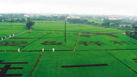 據臺灣《聯合報》報道,2010年桃園縣“稻田彩繪”在平鎮市新貴里登場,從高處俯瞰,由紫色及綠色水稻互為交織,偌大的“愛&祥和”及飛機拉著黑色尾巴圖案,盡在眼底。“稻田彩繪”采收的稻米將全部捐贈弱勢團體。