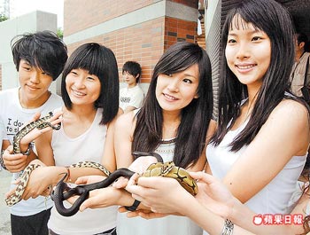 中國臺灣網6月16日消息 據臺灣《蘋果日報》報道,“啊!學校里有蛇!”臺南縣歸仁鄉長榮大學校內昨驚叫聲連連,原來是企管系大四男生卓佳逸帶來18條寵物蛇,秀給同學試膽。