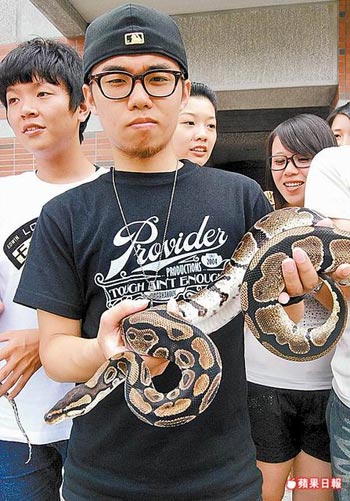 長榮大學大四生卓佳逸帶心愛的寵物蛇到校亮相。來源:臺灣《蘋果日報》