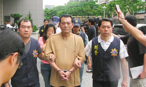 四海幫海竹堂副堂主彭國勝(穿黃衣)及妻子王麗蘭(其后掩面者)、大兒子彭依翰(王麗蘭后戴口罩者),因在竹東地區成立堂口放高利貸,遭刑警逮捕。圖片來源:臺灣《聯合報》