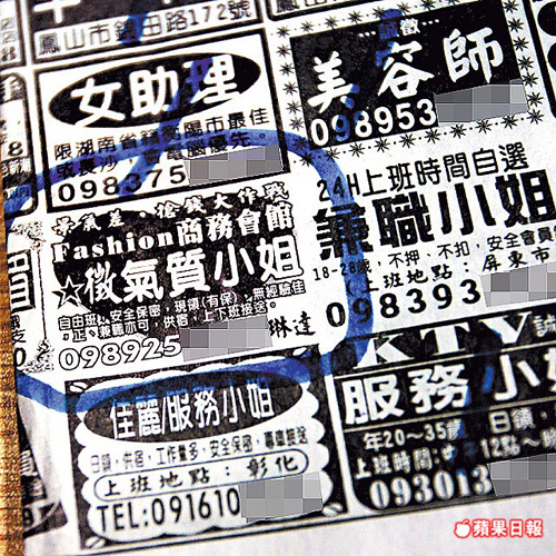 今年三月間,該集團為擴大公司陣容、吸收年輕美眉加入賣淫,在一份人力快報的報紙上刊登分類廣告,征求“氣質小姐”,強調自由班、安全保密、工作輕松,單純陪客人聊天喝酒。