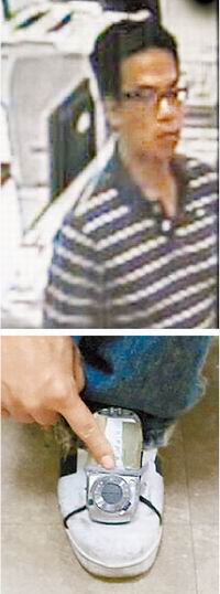 何嫌犯(上圖)將手機(jī)設(shè)定錄像功能,放到鞋帶內(nèi)綁好固定(下圖),隨機(jī)挑選女子偷拍裙底風(fēng)光。