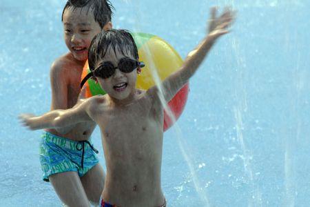 3日下午,臺(tái)北市最高溫達(dá)到攝氏38.6度,創(chuàng)今年入夏以來最高溫。自來水園區(qū)游泳池民眾帶小孩來戲水降溫。圖片來源:“中央社” 施宗暉 攝