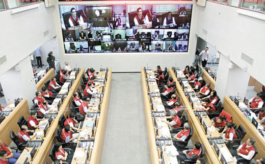 “凡亞比”臺風來勢洶洶,馬英九到臺灣災害應變中心聽取簡報,并與臺灣各縣市首長進行視訊會議。 來源:臺灣《聯合報》