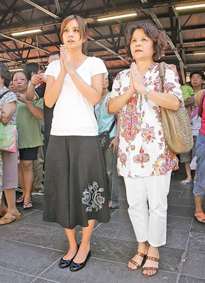 莎莎(左)與母親到行天宮拜拜,她祈求中彈的柯強盡快平安回臺。來源:臺灣《中國時報》