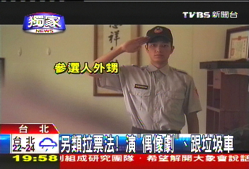 中國臺灣網(wǎng)10月9日消息 據(jù)臺灣TVBS電視臺報(bào)道,“五都”(臺北縣升格后的新北市、臺北市、縣市合并后的大臺中市、大臺南市和大高雄市)選戰(zhàn)進(jìn)入倒計(jì)時階段,市議員參選人抓住最后時機(jī),拼人氣搶選票,絞盡腦汁用盡各種辦法跟選民拉近距離。有的參選人憂慮自己知名度不夠,索性自導(dǎo)自演影片,劇本跟拍攝手法媲美偶像劇,很有質(zhì)感,借此來拉攏年輕選民;有的參選人則跟著垃圾車拜票,哪里有人就往哪里去,到人群集中的地方拉選票。