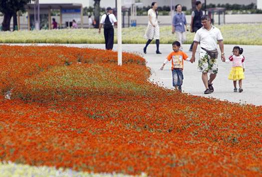 臺北花博會9日展開為期 20天、4 階段測試,開放上千名測試志工進(jìn)入圓山公園區(qū),許多民眾攜家?guī)Ь烨皝恚欢脠@區(qū)內(nèi)的壯觀花海。圖片來源:“中央社”