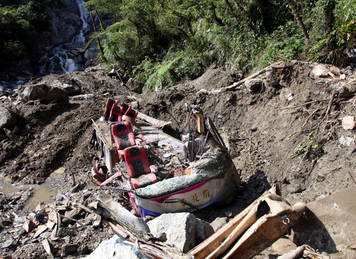因臺風“鲇魚”(梅姬)及其帶來的豪雨造成崩塌困在蘇花公路上的大陸游客,至今仍有20人失蹤。24日記者幾經周折進至塌方最嚴重的114.5公里處。圖為仍陷在該處,但游客已得以逃脫的旅游車。中新社記者 陳立宇 攝