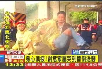 中國臺灣網(wǎng)10月27日消息 據(jù)臺灣TVBS電視臺報道,蘇花公路搜救行動已進(jìn)入第7天,20名失聯(lián)大陸游客的任何消息都牽動著他們家屬的心。焦急等待的心情加上惡劣氣候,使得一名創(chuàng)意旅行社失聯(lián)大陸游客家屬在今(27)日中午哭到昏倒,送醫(yī)救治。