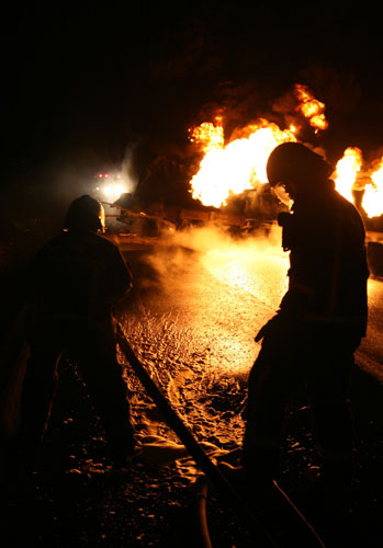 臺灣一輛載有對二甲苯的化學槽車17日凌晨行經(jīng)三號高速公路北上155.5公里苑里路段,撞上1輛轎車,翻覆滑落邊坡爆炸引發(fā)大火,警消出動搶救。 圖片來源:“中央社”