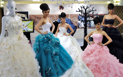 高雄市多家婚紗業(yè)者為迎接年底結婚旺季,24日在高雄市聯(lián)合推出2010秋冬時尚婚紗展,由模特兒走秀展示歐系時尚婚紗禮服。 圖片來源:“中央社”