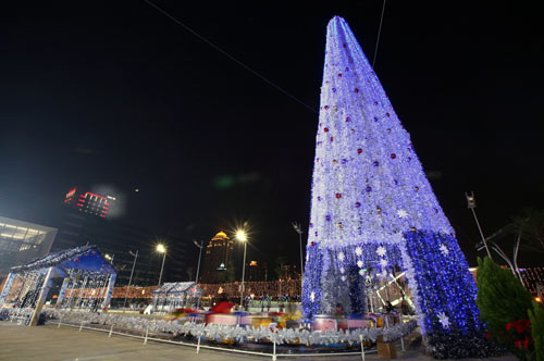 迎接圣誕節到來,臺中市府在新市政中心廣場妝點銀色圣誕樹,9日晚間先試燈,美麗的燈景及鐳射燈光在夜空綻放光芒,與七期重劃區豪宅頂樓燈影相輝映。 圖片來源:“中央社”