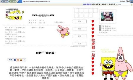 據臺灣“今日新聞”報道,媒體日前曾報道一名初二女生遭霸凌,她被20多人拖到公園扒光衣服、煽巴掌,右耳甚至因此喪失聽力。沒想到,一名疑似在現場的青少女,事后竟然在部落格(博客)上譏諷該少女“被打到出名”,甚至用“破麻”形容對方。更因此在網絡上與人對嗆,自稱“小四就離家,現年小六,日入10萬”,經人肉搜索后被發現其實是17歲的中輟生。