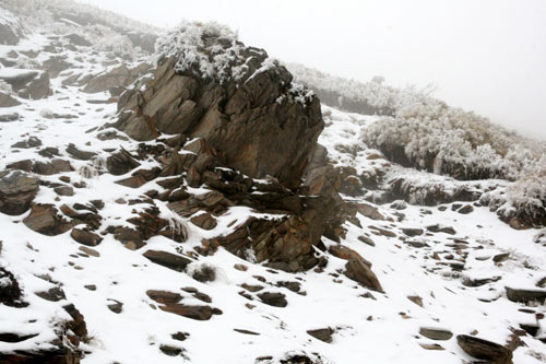 寒流發(fā)威,高山一夜間白了頭。臺灣玉山氣象站表示,合歡山及玉山26日凌晨都飄降瑞雪,合歡山從臺14甲線昆陽以上就可看到雪。圖為昆陽一帶的巖壁一片銀白景色。 圖片來源:“中央社”