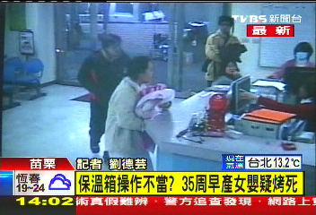 苗栗縣竹南鎮(zhèn)一家婦產(chǎn)科,5日清晨4時45分,接生一名體重1850克的女嬰,由于女嬰提早兩周出生,因此新生女嬰被放置在保溫箱內(nèi)照料,不過3個多小時后,護士發(fā)現(xiàn)女嬰呼吸不順暢,除緊急急救之外,也通知家屬到場,由于急救狀況不樂觀,女嬰也緊急轉(zhuǎn)院急救,但女嬰在到院前就已死亡。