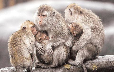 許多動(dòng)物也得強(qiáng)忍低溫。高雄壽山動(dòng)物園的獅王與同伴蜷縮相依、失去威風(fēng),紅毛猩猩裹著軍毯趴趴走,園方還為樹獺、綠鬣蜥加裝保溫?zé)簟⒎里L(fēng)帆布。臺北市立動(dòng)物園的猴子則瑟縮依偎、把小猴緊抱懷中取暖。