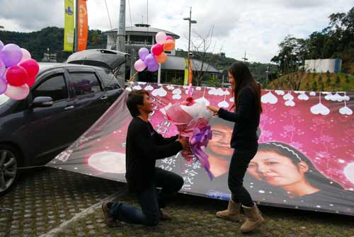 廖振坤事先與日月潭纜車公司協(xié)調(diào)求婚計(jì)劃,包下5格大客車停車空間,布置求婚大看板,上面除有兩人的放大合照畫面,并印上“讓我用行動(dòng)來表達(dá)我對你的愛,請嫁給我吧”等告白字句。