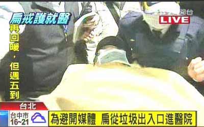 陳水扁戒護送醫,抵達桃園醫院時,獄方和院方為了回避媒體而選擇醫院垃圾出入口將扁送進醫院。 圖片來源:臺灣TVBS