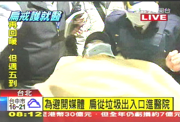 陳水扁上午從隔離通道進(jìn)醫(yī)院,因通道出入口放置垃圾,引發(fā)走“垃圾通道”爭議,下午則被安排走側(cè)門離開。桃園醫(yī)院副院長徐錦池表示,隔離通道是提供感染病人、監(jiān)所收容人使用,資源回收也使用同一出口,并非垃圾專用通道,沒有禮遇或鄙視的意思。