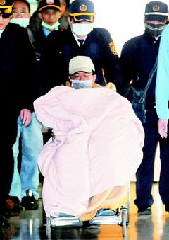 陳水扁19日上午7點25分在警方戒護(hù)下,搭乘臺北監(jiān)獄救護(hù)車前往桃園醫(yī)院,他全身被毛毯包住,躺在擔(dān)架上,只露出所戴的帽子和口罩。