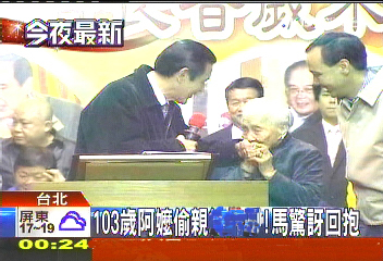 中國(guó)臺(tái)灣網(wǎng)1月23日消息 據(jù)臺(tái)灣TVBS電視臺(tái)報(bào)道,馬英九昨天(22日)傍晚和獨(dú)居老人溫馨圍爐大團(tuán)圓,親手包刈包給老人吃,還被103歲的人瑞阿嬤偷吻。馬英九驚訝之余,感動(dòng)地?fù)肀О摺0邉t說(shuō),她才是老人,在她眼中,小她40歲的馬英九就像孩子。(中國(guó)臺(tái)灣網(wǎng) 吳斌)