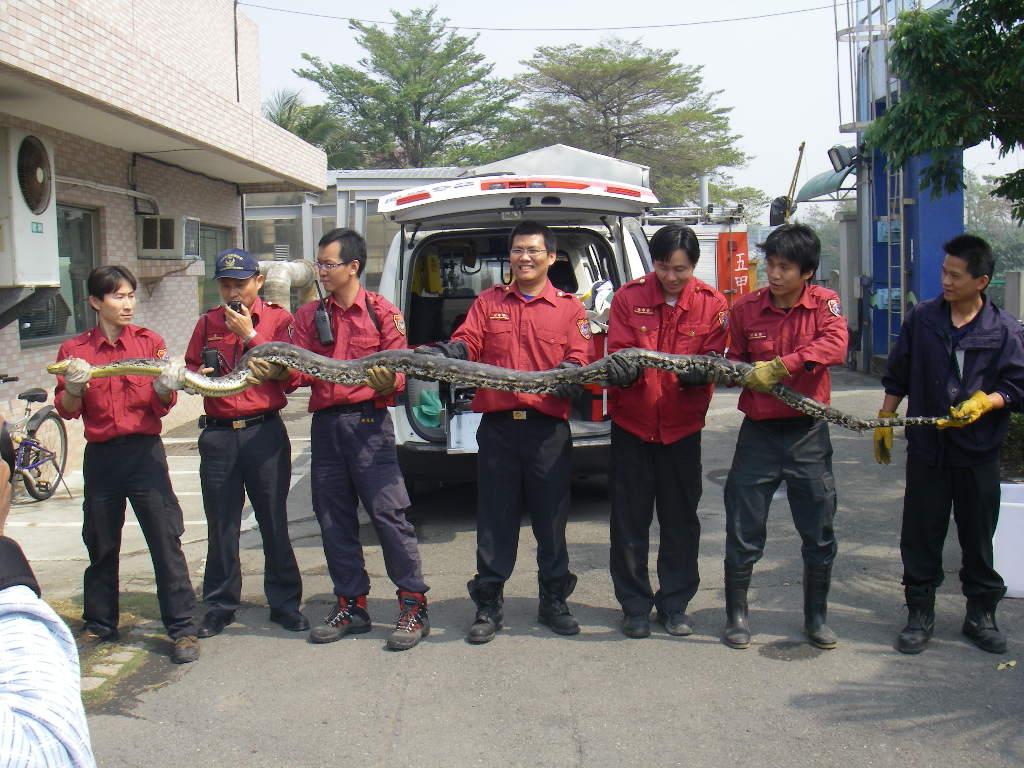 據報道,高雄市消防局今天中午接到報案指出,高雄市某高速公路截流站的排風管上方突然出現不速之客——一條超級大蟒蛇。因蟒蛇十分巨大,先到現場的兩名消防隊員不敢輕舉妄動,于是通報勤務中心,后來連同6名支援隊員合力將蟒蛇擒獲。