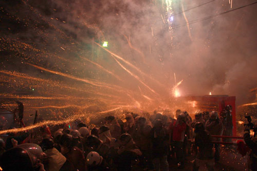 臺(tái)南鹽水蜂炮16日晚間進(jìn)入首波施放高潮,大小炮城陸續(xù)施放,吸引許多游客到場(chǎng)體驗(yàn)“犁蜂炮”的快感。圖片來(lái)源:“中央社”