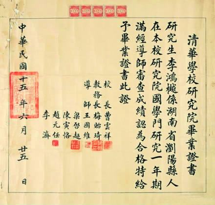 這4位導師確實是當時清華大學中文院的4大導師,清華中文院當時也只有這4位導師。四位大學問家負責指導全院的學生,因此中文院研究生的畢業證書上都印著他們的名字。