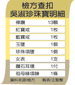 報(bào)道稱,臺(tái)特偵組于偵查中2度搜索扁家,將吳淑珍珍藏的大量珠寶扣案。這些珠寶琳瑯滿目,包括從扁家友人黃芳彥西裝口袋找到的裸鉆一共13顆、紅寶戒1只、藍(lán)寶鉆戒1只、玉墜1顆、珍珠項(xiàng)墜1條、女表1支、鉆石耳環(huán)1付、祖母綠項(xiàng)鏈1條,價(jià)格不詳。