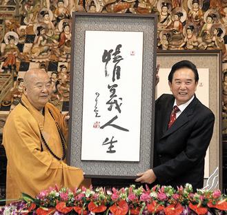大陸海協會長陳云林(右),昨天到高雄佛光山參訪,星云法師(左)贈送墨寶“情義人生”給他。
