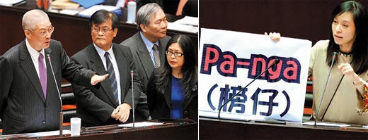 吳敦義被質詢海基會廣告中“榜仔”是什么意思時,吳敦義面色凝重表示歉意。