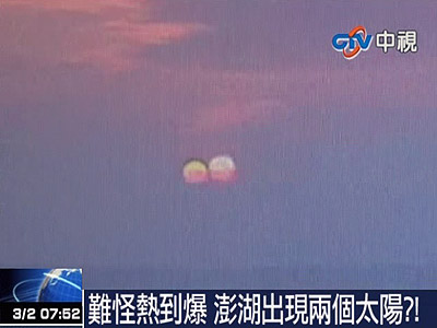據(jù)報(bào)道,臺(tái)灣網(wǎng)絡(luò)近日瘋傳一組澎湖“兩個(gè)太陽(yáng)”的奇異照片。照片當(dāng)中,好像真的出現(xiàn)兩個(gè)太陽(yáng),相偎相依,網(wǎng)友稱(chēng)之為奇特的“太陽(yáng)雙胞胎”景象。有網(wǎng)友表示,“莫非太陽(yáng)也有分身術(shù),難道天真有異象嗎?”
