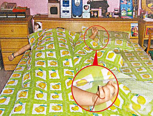 葉啟賢、郭美秀自殺前,還以紅線兩端分別綁在女方左手(小圖)、男方右手的尾指。圖片來源:臺灣媒體