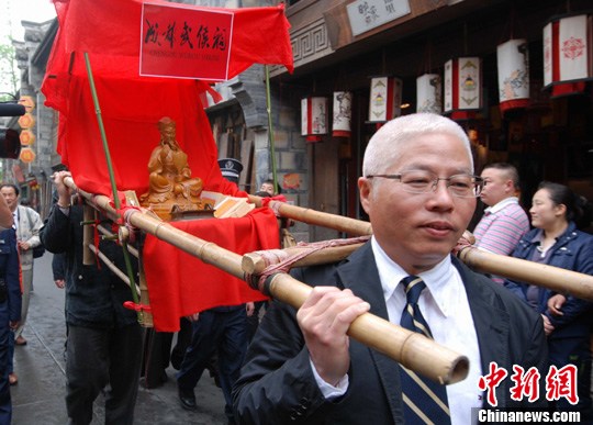 4月17日上午,在“三國圣地”成都武侯祠博物館三義廟,臺灣民間文化團體“十分老街觀光發展協會”舉行了隆重的祭典儀式。圖為迎駕隊伍走過成都錦里古街。中新社發 羅景玠 攝