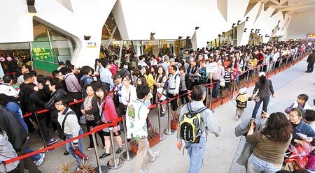 由于是花博展期的最后一個周末,拜天公作美之賜,許多入園民眾幾乎是全家動員、扶老攜幼,舉目所見,不管是在熱門展館或紀念品銷售處,都是大排長龍,擠得水泄不通。