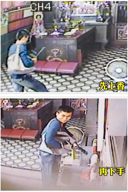 林煒強(qiáng)先點(diǎn)香拜拜求心安(上圖);破壞賽錢箱時,賊頭賊腦觀察周邊動靜(下圖)。圖片來自網(wǎng)絡(luò)