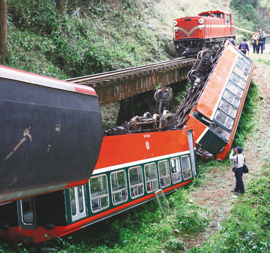 阿里山神木支線小火車27日中午載著300多名游客駛往阿里山站,途中邊坡一棵青剛櫟突然斷裂,擊中第七節(jié)車廂,前后四節(jié)車廂隨即翻覆,造成5名大陸旅客死亡、107名陸客及本地導游輕重傷。圖片來源:臺灣《聯合報》