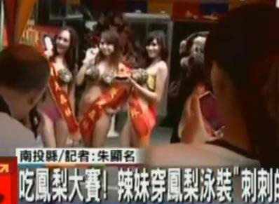 據報道,南投縣一鳳梨酥業者要促銷鳳梨酥,請來辣妹穿上菠蘿泳裝走秀,還舉辦吃菠蘿大賽,比比看誰能在最短時間內吃完整顆菠蘿;而3位菠蘿公主則把菠蘿果肉挖空之后當胸罩,并招呼民眾舔食,F場“升級”不少,不少路人前來圍觀拍照,“目不轉睛”,并踴躍“嘗試”。