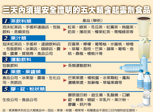 據(jù)臺灣《聯(lián)合報(bào)》報(bào)道,臺灣衛(wèi)生主管部門清查可能使用昱伸公司含塑化劑成分起云劑廠商,目前已有186家,其中已調(diào)查119家,可能受污染產(chǎn)品達(dá)371項(xiàng)。昨天又有多家知名廠商淪陷,產(chǎn)品被驗(yàn)出塑化劑,包括知名手搖杯連鎖店日出茶太的百香果汁、休閑類的鑫和釣蝦場,也疑用到含塑化劑的起云劑。
