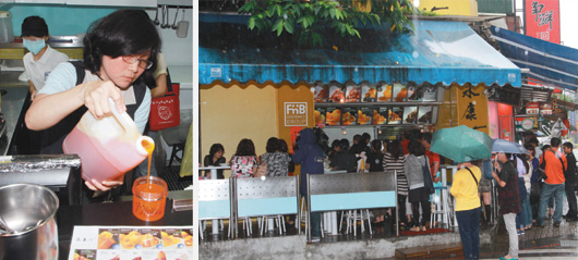 臺北市政府衛(wèi)生局人員(左圖)昨天至永康街,抽查三家知名冰店,沒有發(fā)現(xiàn)業(yè)者使用昱伸的產(chǎn)品,但將業(yè)者沒有明確來源的果醬、果漿等冰品原料攜回檢驗(yàn)。衛(wèi)生局人員在店內(nèi)抽查時(shí),店外等著吃冰的民眾仍大排長龍(右圖)。 圖片來源:臺灣《聯(lián)合報(bào)》