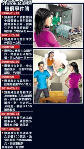 據臺媒了解,15年前,劉妻發現丈夫與李女有染,李女苦求原諒,丈夫也說愿悔改,劉妻同意不提告,但堅持丈夫要結扎杜絕后患。劉妻押丈夫到臺灣醫藥大學附設醫院手術,不料丈夫卻在陰囊挨一刀后,中途要醫師停止手術,醫院為避免糾紛,在病歷上敘明此狀況,并要劉男在病歷上簽名。3年前,劉男才向妻子坦承與李女已婚外生女。
