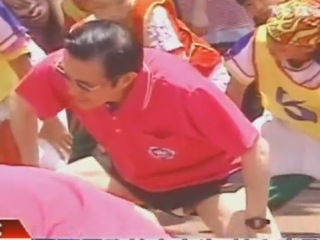 馬英九參加東園小學百年校慶,下場跟小學生比賽800米接力賽,當他抬腿暖身、雙腳打開下蹲,露出白色內褲。圖片來源:臺灣“今日新聞網”