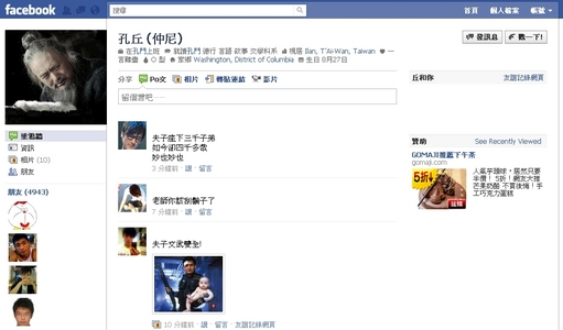 打開臉書發現最近不少人都有一個共同好友,那就是“孔丘”,此人名寫孔丘,字仲尼,自稱在孔門上班,現居臺灣宜蘭,家鄉是華盛頓,只是大頭貼看起來眼熟,是周潤發飾演的電影《孔子》劇照。