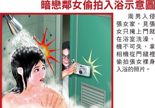 昨天凌晨一時許,周姓男子透過窗戶發(fā)現(xiàn)張女返家,便帶相機(jī)侵入其住處,張女正在浴室洗澡門未緊閉,周姓男子見機(jī)不可失,拿相機(jī)從浴室門縫連拍三張照,張女聽到快門聲發(fā)現(xiàn)被偷拍,嚇得尖叫,沖回房間穿衣、打電話通知母親報(bào)警。