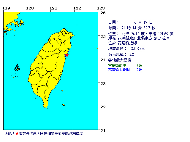 中國臺灣網6月17日消息 據臺灣氣象部門官網報道,17日21時14分,臺灣花蓮縣政府北偏東方20.7公里處發生里氏3.8級地震,地震深度為18.8公里。