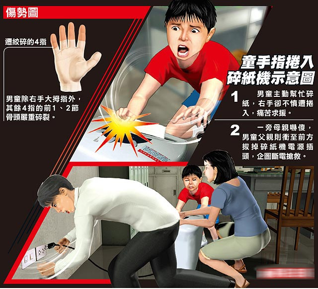 據(jù)臺(tái)媒了解,焦姓男童的父親因工作原因,帶著妻兒回辦公室整理物品,并將不需要的數(shù)據(jù)用碎紙機(jī)軋碎。男童疑因好奇,趁著父母不注意時(shí),悄悄地將右手伸進(jìn)碎紙機(jī)的走紙口內(nèi),沒(méi)想到手指就遭卷進(jìn),男童痛得哇哇大叫;雙親看到兒子慘狀,立刻向臺(tái)灣消防部門(mén)求援。