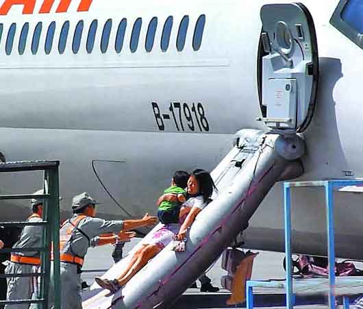 鄭先生說,班機(jī)慢慢滑回停機(jī)坪時(shí),后座有乘客因忍受不了油煙味及焦味,嚇得不斷跟空服員反映:“有很濃煙味,請(qǐng)快處理!”但未獲空服員回應(yīng),直到滑行10多分鐘后,飛機(jī)終于停妥,后方旅客不斷鼓噪要求下機(jī),空服員不斷說:“請(qǐng)留在座位上,不要任意走動(dòng)!”但隨后空服員開始動(dòng)作,打開左側(cè)逃生門,要求乘客不要帶行李,跳逃生筏逃生。