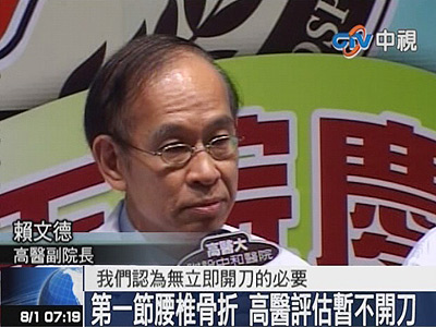 據報道,高雄市長陳菊30日赴宜蘭縣冬山河親水公園參加童玩節活動后,回當地飯店時不慎滑倒,摔傷腰椎,31日中午至高雄醫學大學附設醫院就醫,經院方診斷,確認她的第一腰椎裂傷,必須住院靜養,且至少得住10至14天,